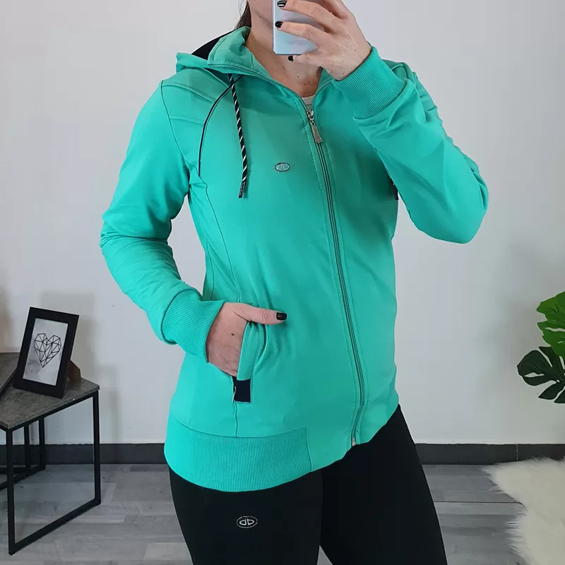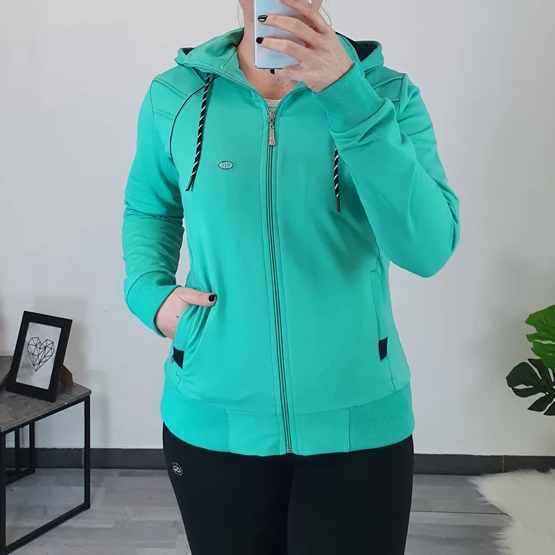 Ženska športna jopa v zeleni barvi. Jopa ima dolga rokava, je oprijetega modela in se zapenja z zeleno zadrgo. Ima visok ovratnik in kapuco – notranja stran kapuce je v temno modri barvi. Na sprednji strani ima dva stranska žepa ki se zapenjata z zadrgo. Izdelana je iz 100% bombaža in je udobna za nošenje.
