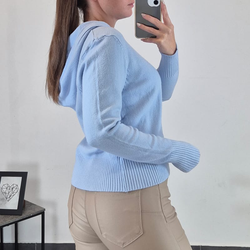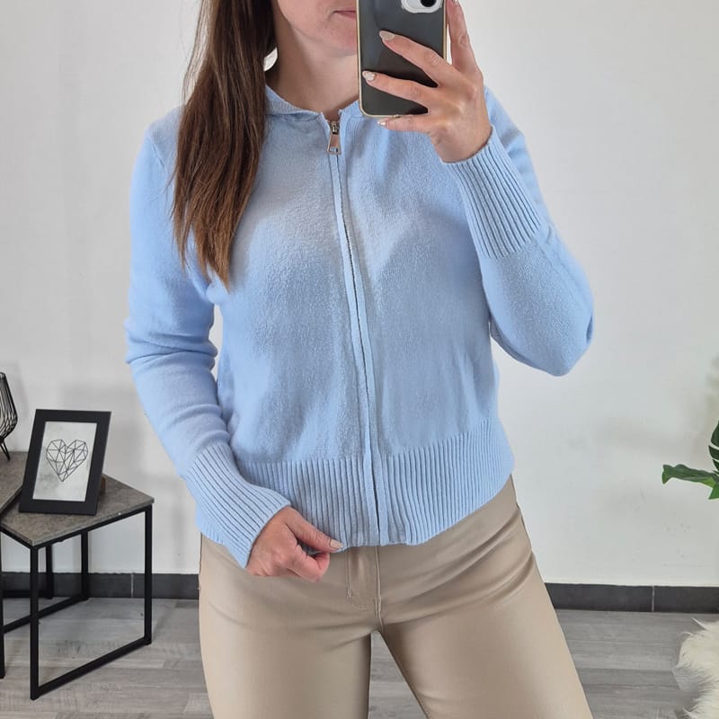Ženska jopica 88446 v svetlo modri barvi. Jopica je krajšega kroja in ima kapuco. Odlično se bo podala s pisanimi ali enobarvnimi majicami. Na voljo sta številki S/M in L/XL.