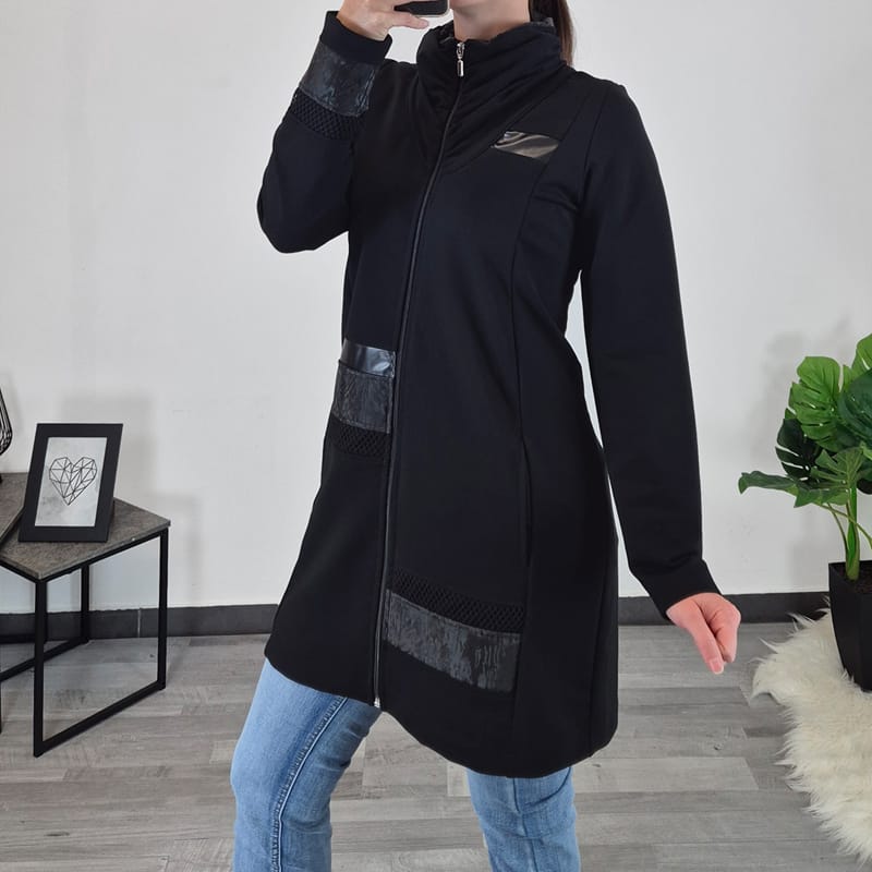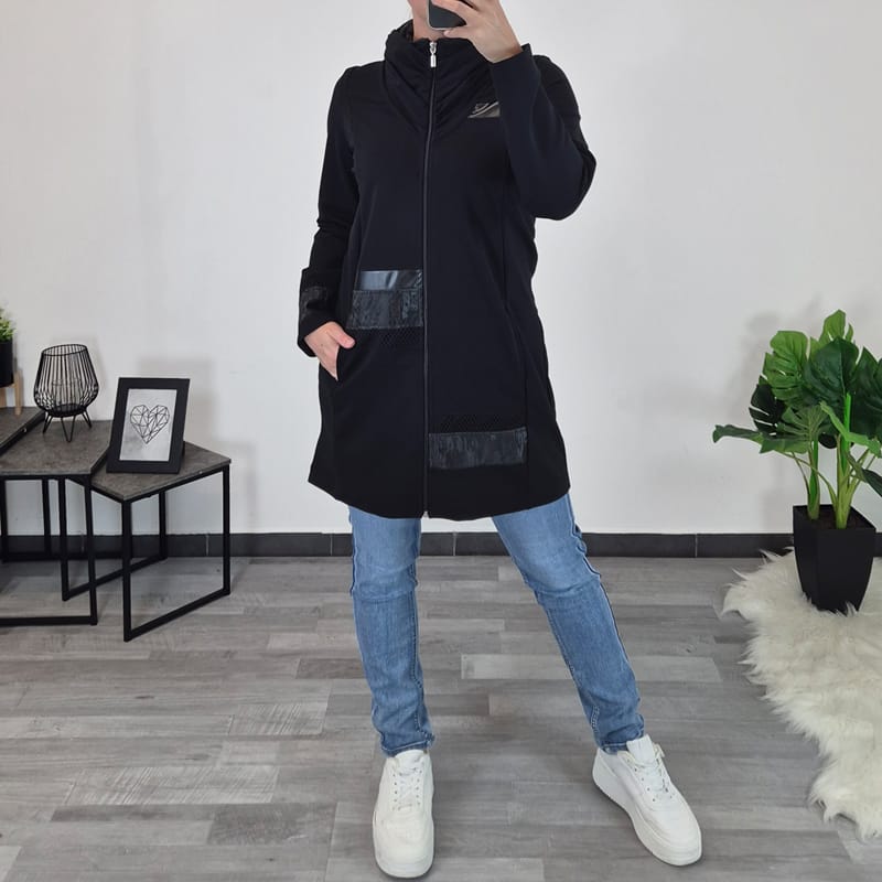 Ženska jopa Asi v črni barvi. Jopa je daljšega kroja, z visokim ovratnikom, ima dodane žepe. Jopa je na sprednji strani kombinirana z umetnim usnjem in mrežico.