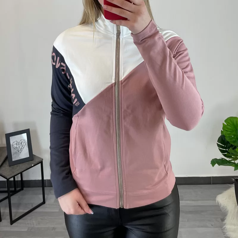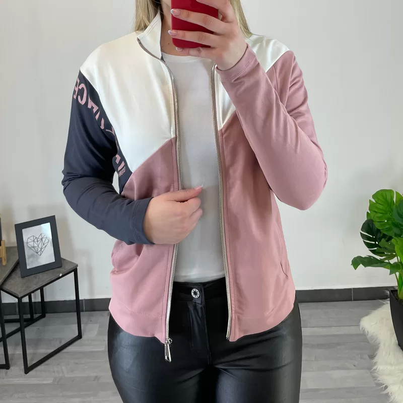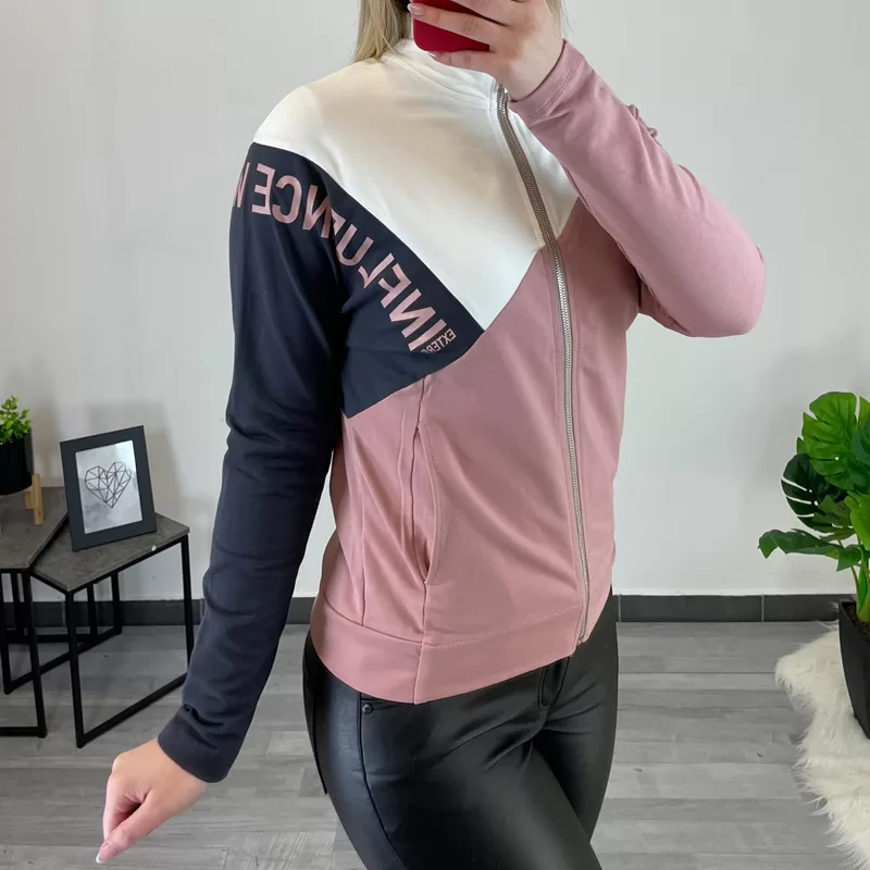 Ženska modna jopa z ovratnikom. Jopa se po celotni dolžini zapira z zadrgo, ob straneh ima žepe. Jopa je narejena iz bombaža, sestavljena je iz roza, bele in temno sive barve. Na sivi podlagi ima roza napis ‘influence wear’.