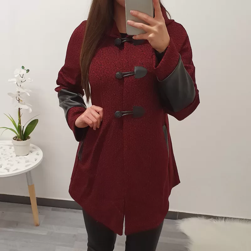 Jopa Hedera v črno – rdeči barvi. Jopa ima žepe in kapuco, rokava krasi umetno usnje.