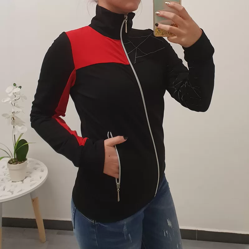 Modna športna jopa Jasmina v kombinaciji črne in rdeče barve. Jopa ima srebrno zadrgo, dva žepa in visok ovratnik (brez kapuce). Na desni zgornji strani in rokavu je dodan srebrn tisk.
