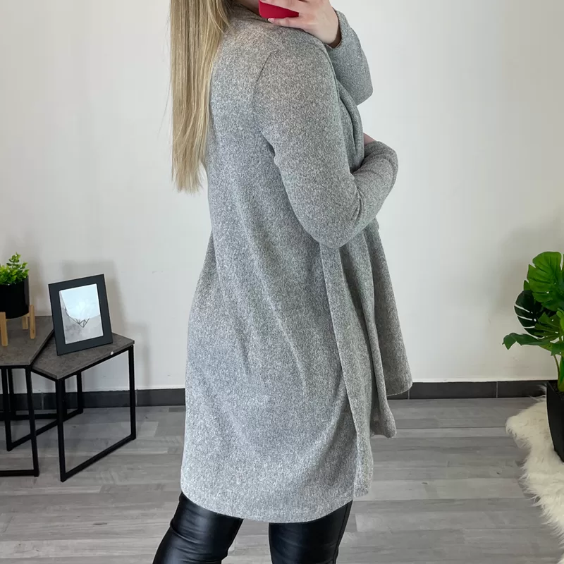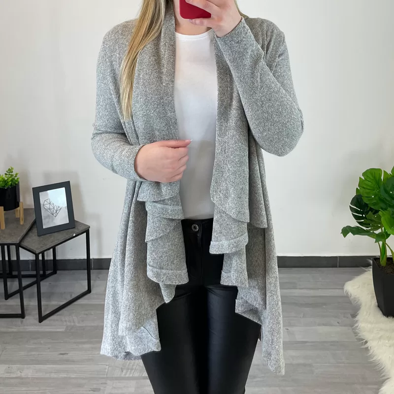 Modna ženska jopa Lena v svetlo sivi barvi. Jopa ima dolga rokava, je za ogrnit in je širšega modela. Sprednja stran jope je rezana asimetrično, kar ustvari valovito obliko in jopi daje zanimiv izgled. Na voljo je od številke 36/38 do 44/46.