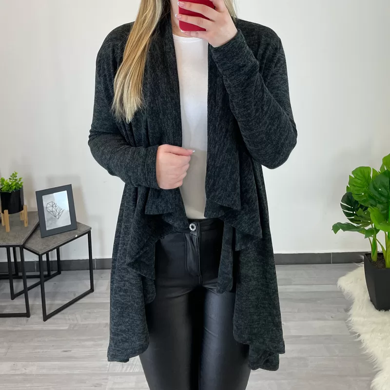 Modna ženska jopa Lena v temno sivi barvi. Jopa ima dolga rokava, je za ogrnit in je širšega modela. Sprednja stran jope je rezana asimetrično, kar ustvari valovito obliko in jopi daje zanimiv izgled. Na voljo je od številke 36/38 do 44/46.
