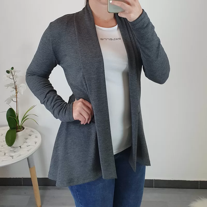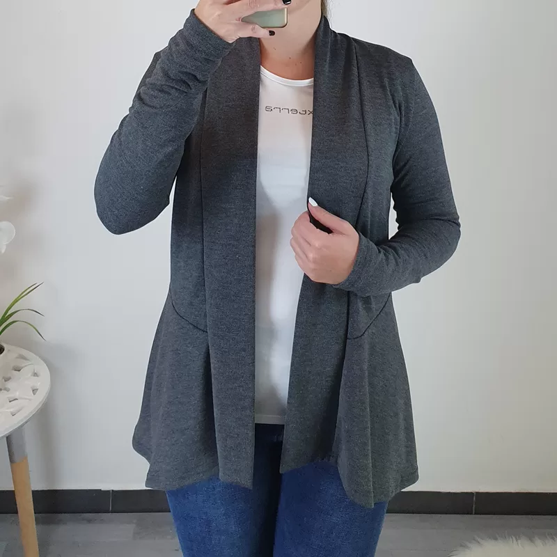 Elegantna ženska viskozna jopica v sivi barvi. Jopica ima dolga rokava, kroj pa je malo daljši in lepo pade preko bokov. Jopica je brez zadrge in je lahko odlična kombinacija z pisanimi majica. Izdelana je iz kvalitetne viskoze. Na voljo je od številke 36 pa do številke 48.
