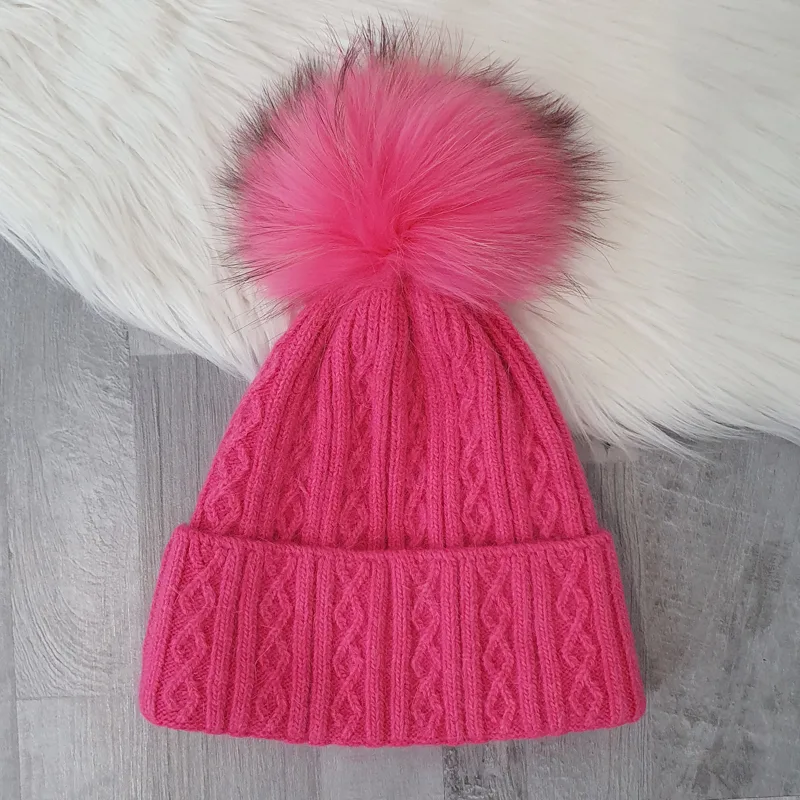 Ženska pletena kapa z zavihanim robom. Kapa je v roza barvi, dodan ima bogat cof. Je izredno topla saj je narejena iz mešanice viskoze in volne, primerna za hladnejše dni.