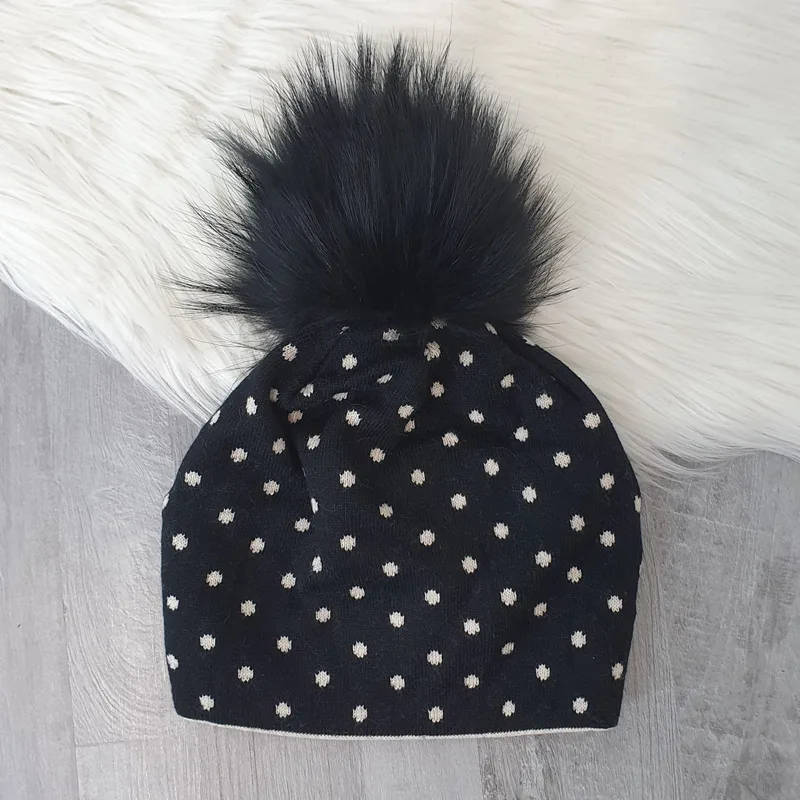 Ženska pletena kapa v črni barvi z belimi pikami, dodan ima bogat cof. Je izredno topla saj je narejena iz mešanice viskoze in volne, primerna za hladnejše dni.
