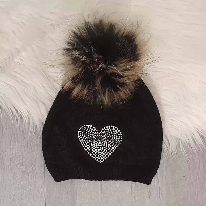 Ženska zimska kapa v črni barvi s cofkom. Na sprednji strani kape je srček iz kristalčkov.