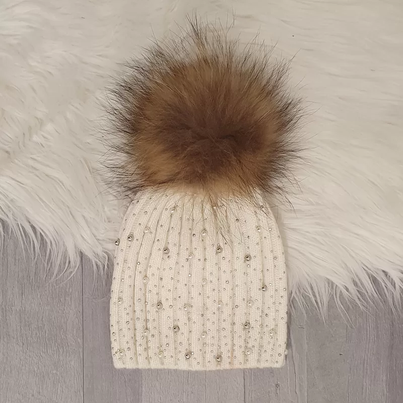 Ženska zimska kapa v beli barvi s cofkom in perlami.
