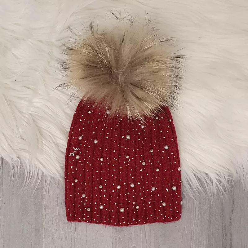 Ženska zimska kapa v bordo barvi s cofkom in perlami.