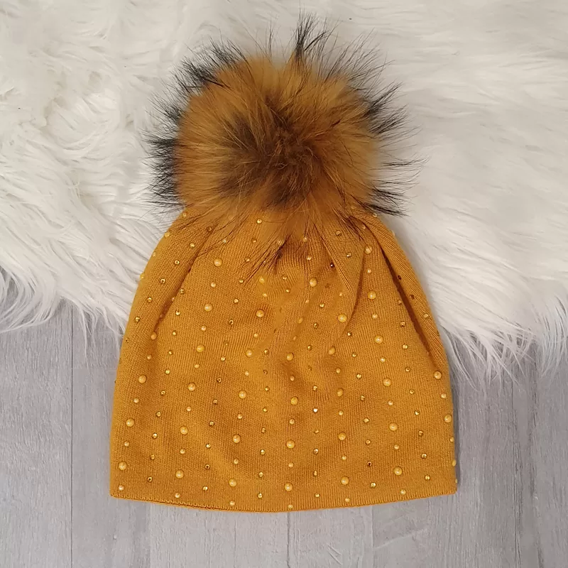 Ženska zimska kapa v gorčično rumeni barvi s cofkom in perlami.