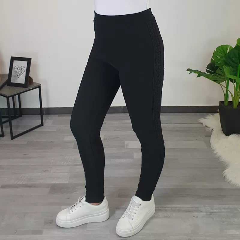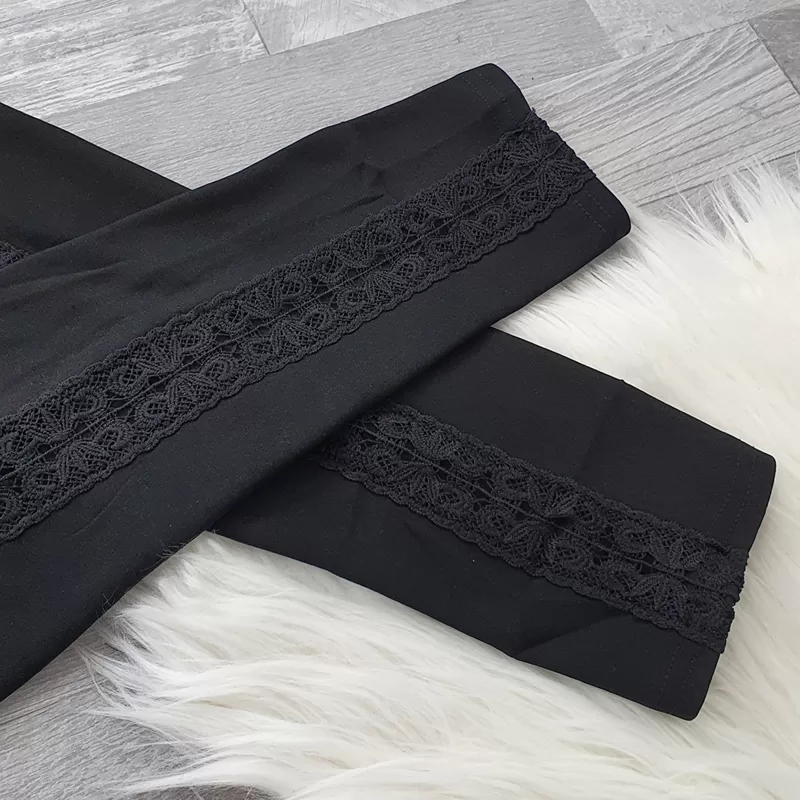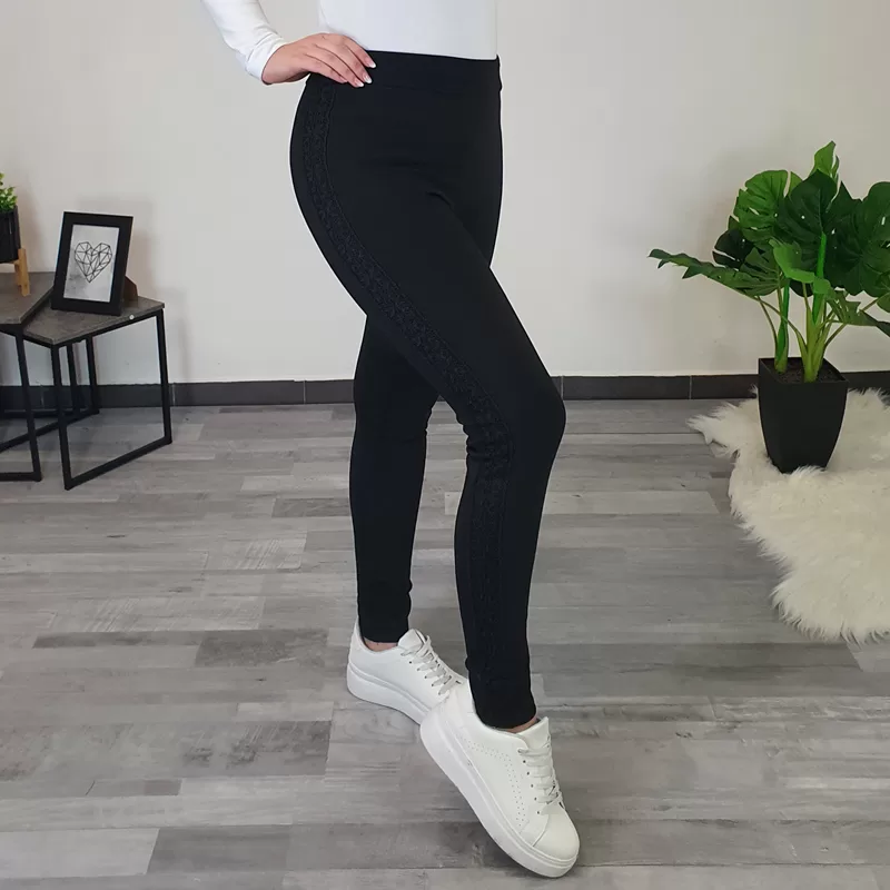 Ženske pajkice v črni barvi. Pajkice imajo visok pas, v pasu je dodana elastika. Hlačnice so dolge in oprijete, na zunanji strani hlačnic pa je dodana čipka po celotni dolžini. Pajkice so podložene, primerne so za hladnejše zimske dni.