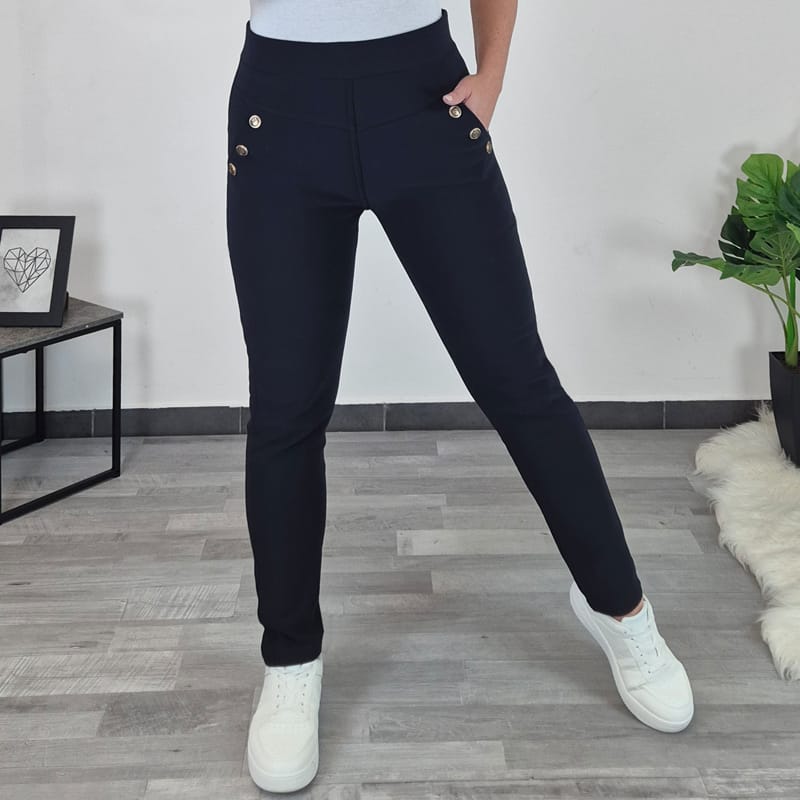 Ženske pajkice v temno modri barvi. Pajkice imajo visok pas, v pasu je dodana elastika. Hlačnice so dolge, imajo dva žepa na katerih so zlati gumbi za dekoracijo. Pajkice so podložene, primerne so za hladnejše zimske dni.