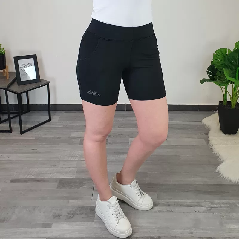 Ženske športne hlače 210-K v črni barvi. Hlače imajo višji pas in dva stranska žepa, hlačnice so kratke in oprijete. V pasu so na elastiko in so udobne za nošenje. Hlače lahko nosite za športne aktivnosti ali za prosti čas. Na voljo so od številke XS do L.