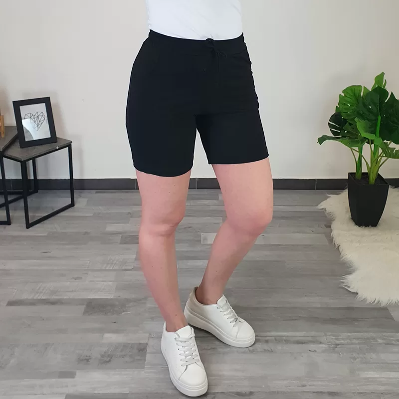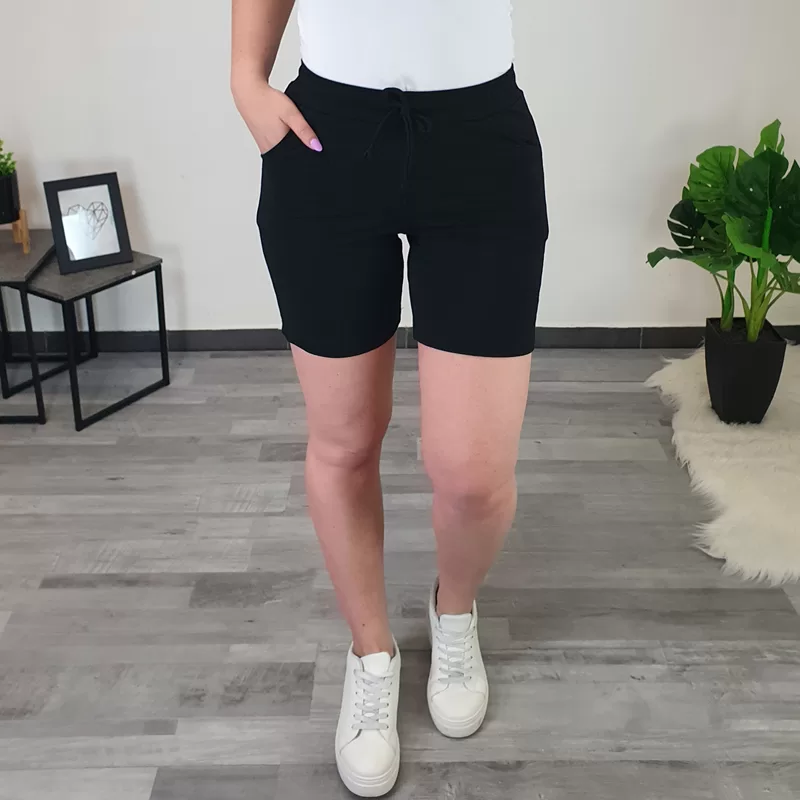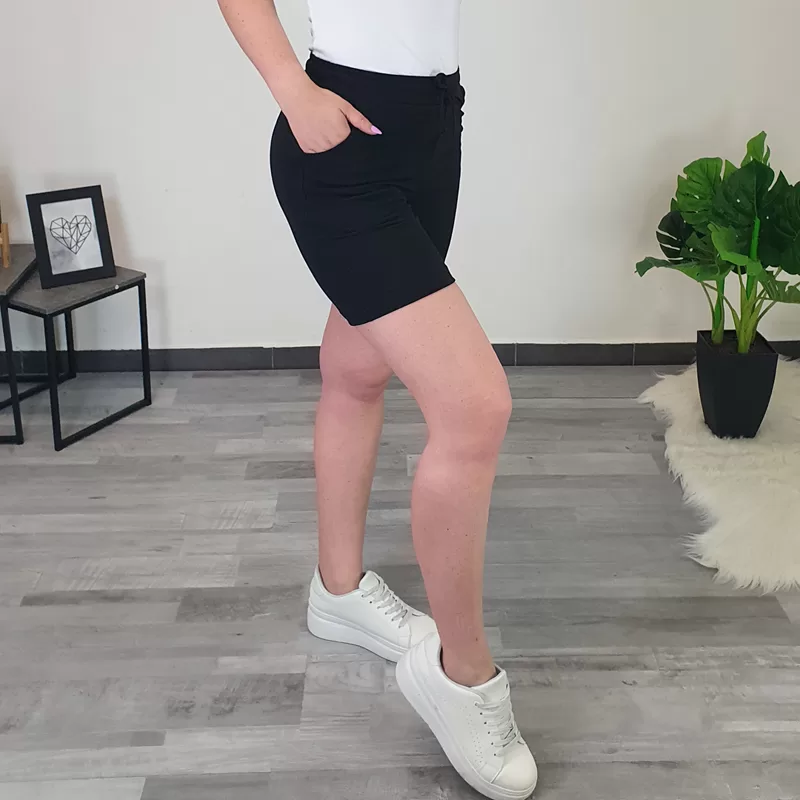 Ženske kratke hlače Marička. Hlače so narejene iz elastičnega in mehkega bombaža in so v črni barvi. Hlače imajo v pasu elastiko in vrvico, na sprednji strani sta dodana dva žepa. Krojene so do velikosti 52.