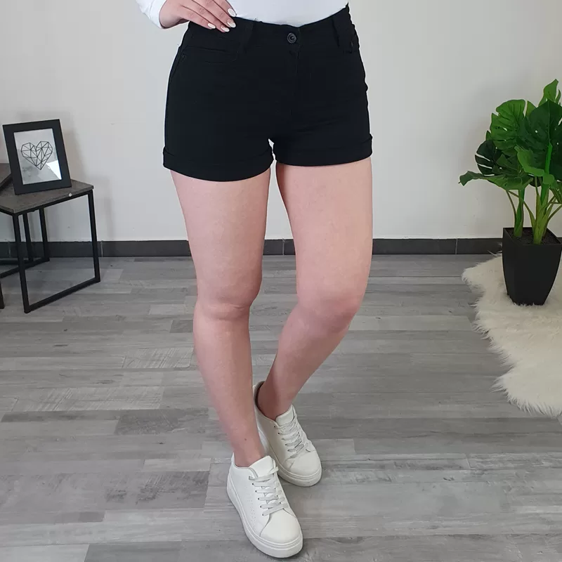 Ženske push up hlače SA9370 v črni barvi. Kavbojke so kratke, izdelane so iz kvalitetnega bombaža in so zelo elastične ter udobne za nošenje. Imajo višji pas, zapenjajo se na gumb in zadrgo, imajo dva žepa na sprednji strani in dva žepa na zadnji strani. Hlačnice so zavihane. Hlače boste odlično kombinirale s svojimi najljubšimi oblačili.