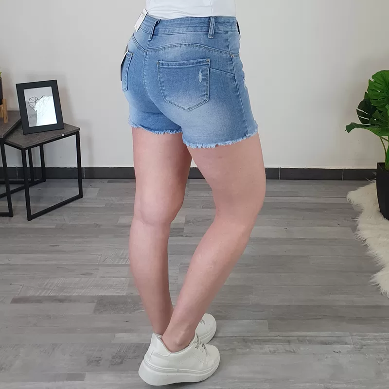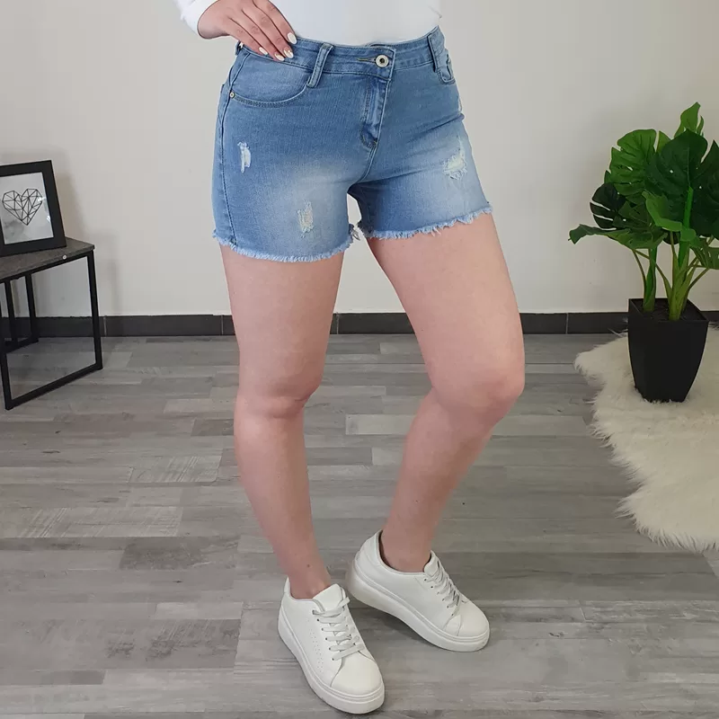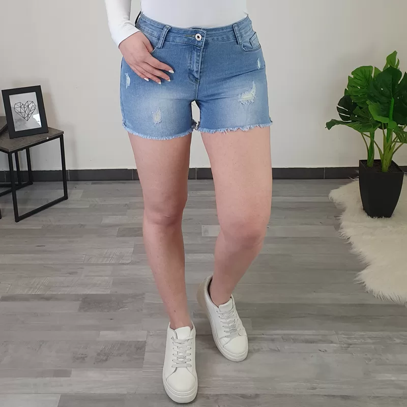 Ženske push up kavbojke v svetlejši jeans barvi. Kavbojke so kratke, izdelane so iz kvalitetnega bombaža in so zelo elastične ter udobne za nošenje. Imajo videz spranega jeansa, hlačnice so natrgane. Zapenjajo se na gumb in zadrgo, imajo dva žepa na sprednji strani in dva žepa na zadnji strani. Hlače boste odlično kombinirale s svojimi najljubšimi oblačili.