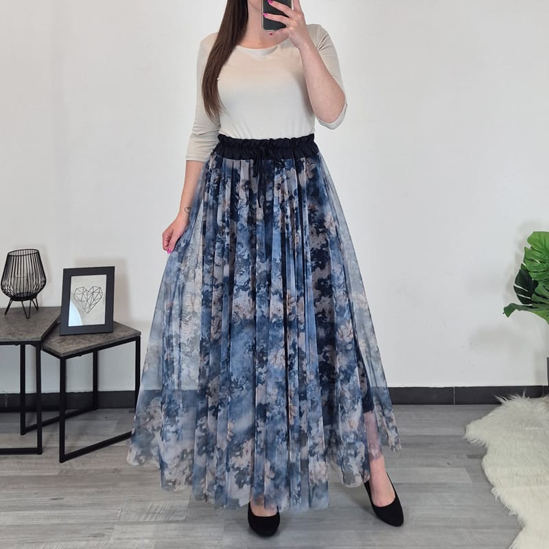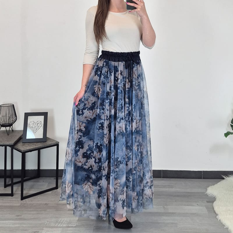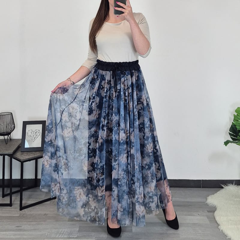 Modno žensko krilo v kombinaciji modre in bež barve. Krilo je sestavljeno iz dveh delov – spodaj je modro blago, zgoraj pa til s cvetličnim vzorcem. Dolžina krila je daljša, sega čez kolena. V pasu je na elastiko. Velikost je univerzalna, primerna za S-L.