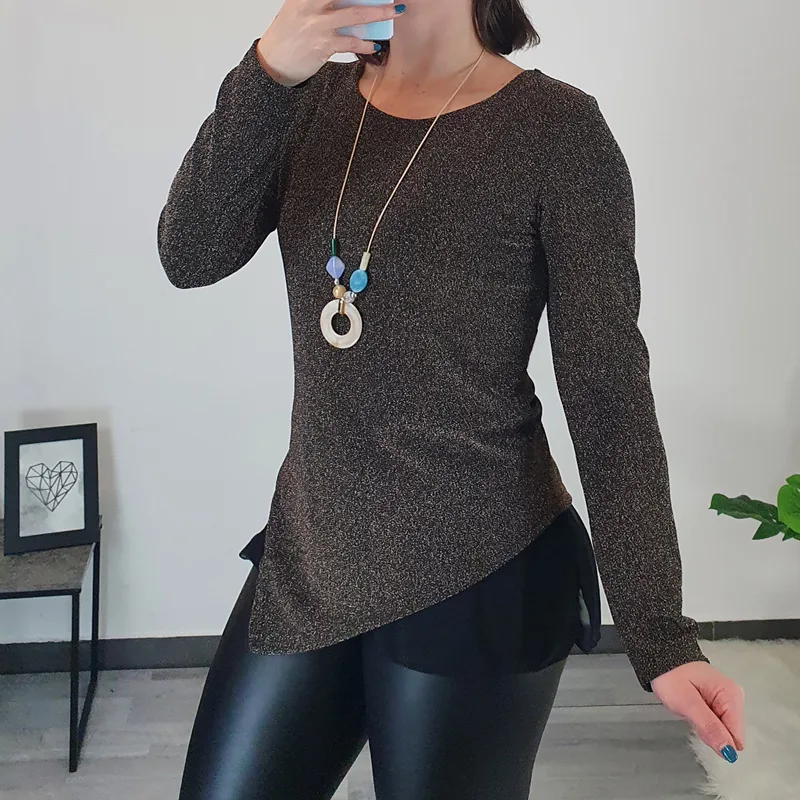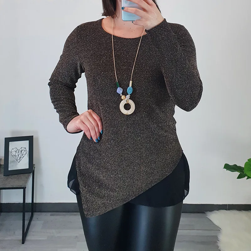 Elegantna majica v zlati barvi. Kroj majice je asimetričen, spodaj je dodan til, ki je viden le na krajšem delu majice ob strani. Izdelana je iz svetlečega materiala v zlati barvi, spodaj je podložena s tkanino iz viskoze. Velikost je UNI – majica je ožja, zato je primerna za velikost S/M.