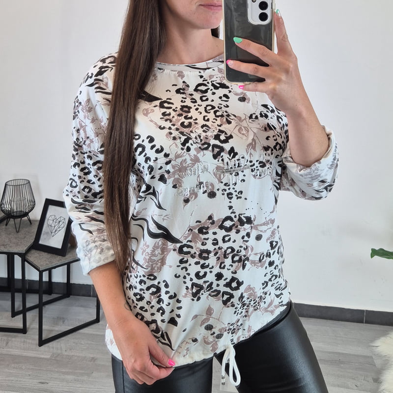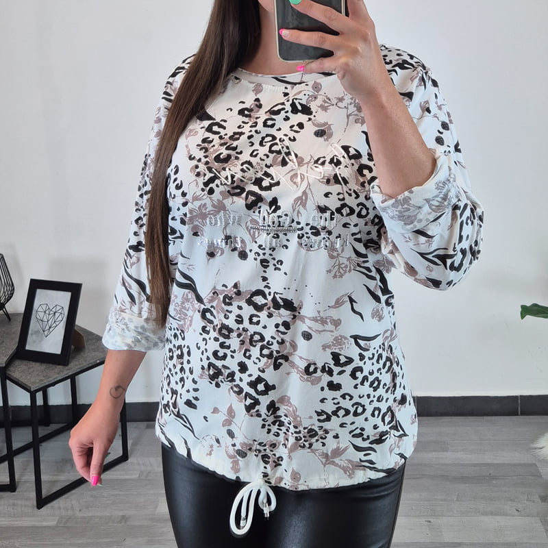 Ženska majica z dolgimi rokavi ali 3/4 rokavi, zavihate jih lahko po želji. Narejena je iz bombaža in je prijetna za nošenje. Kroj majice je širši, na spodnjem delu ima vrvico s katero majico oblikujete. Vzorec je pisan, v črni, bež in rjavi barvi. Velikost je univerzalna, primerna za velikosti od M do XXL.
