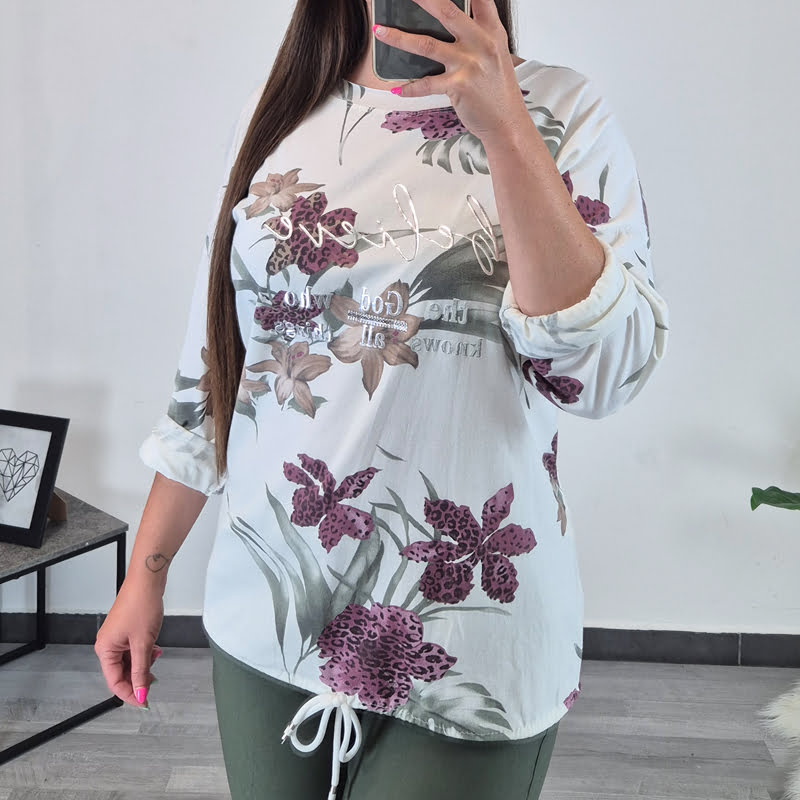 Ženska majica z dolgimi rokavi ali 3/4 rokavi, zavihate jih lahko po želji. Narejena je iz bombaža in je prijetna za nošenje. Kroj majice je širši, na spodnjem delu ima vrvico s katero majico oblikujete. Vzorec je pisan, v roza in zeleni barvi. Velikost je univerzalna, primerna za velikosti od M do XXL.