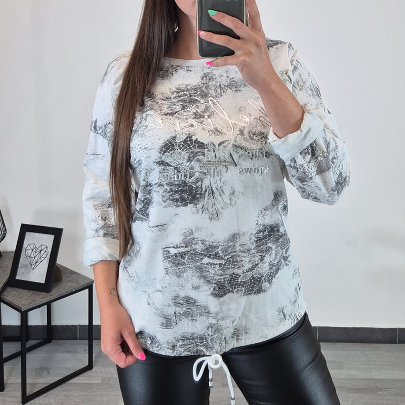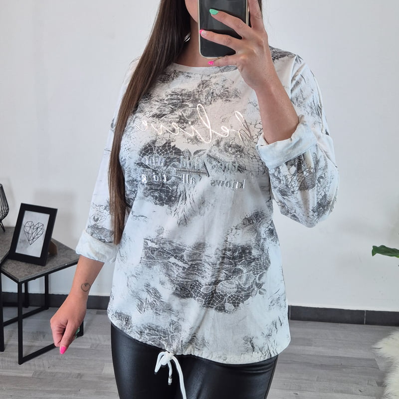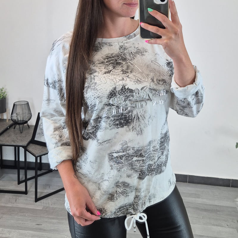 Ženska majica z dolgimi rokavi ali 3/4 rokavi, zavihate jih lahko po želji. Narejena je iz bombaža in je prijetna za nošenje. Kroj majice je širši, na spodnjem delu ima vrvico s katero majico oblikujete. Vzorec je pisan, v sivi in črni barvi. Velikost je univerzalna, primerna za velikosti od M do XXL.