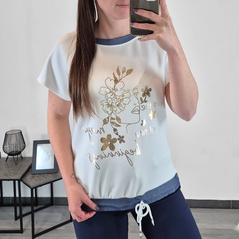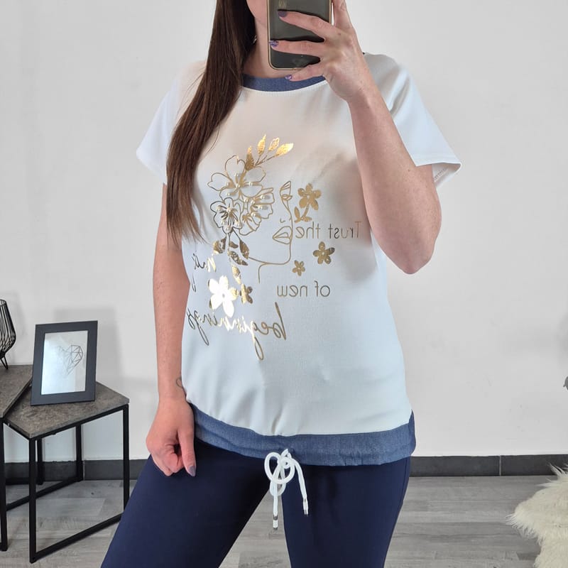 Ženska majica s kratkimi rokavi v beli barvi. Na sprednji strani ima tisk v zlati barvi. Dodane so perlice. Narejena je iz mešanice viskoze, zato je mehka na otip in lahka. Kroj majice je širši, spodaj ima vrvico, s katero lahko prilagodite širino. Majica je univerzalne velikosti, primerna za M do XXL.