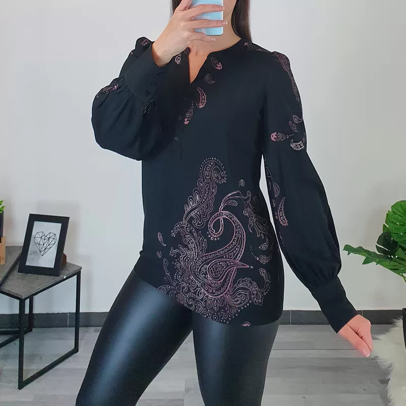 Elegantna ženska bluza v črni barvi, dodani so tudi vzorci v vijoličnih odtenkih. Majica ima dolga in široka rokava, na koncu rokava so dodani trije manjši gumbi. Bluza je širšega kroja, na sprednji strani ima izrez na ‘V’, izrez krasijo tudi gumbi. Majica je športno elegantna in se odlično poda na vaše najljubše supege in petke.
