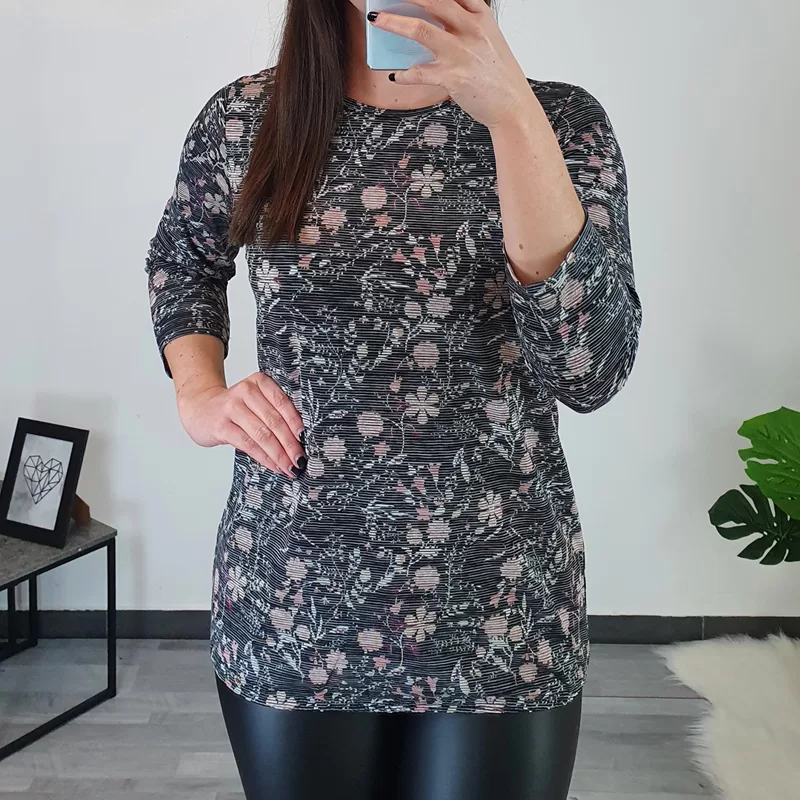 Ženska majica v črni barvi. Majica ima 3/4 rokava, na koncu se zaključi z elastiko, zaradi katere lepo pada po telesu. Krasita jo črtast in cvetlični vzorec. Izdelana je iz kvalitetne mešanice viskoze in poliestra, na voljo pa je do številke XXL.