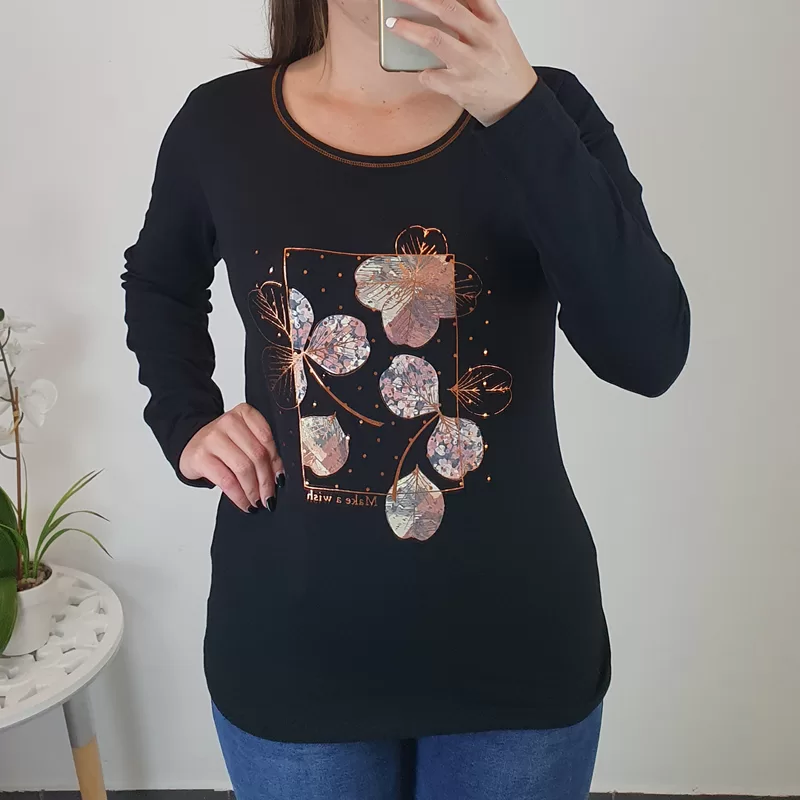 Ženska bombažna majica z dolgimi rokavi. Majica je v črni barvi, na sprednji strani jo krasi zlati tisk z deteljicami in napisom ‘Make a wish’. Majica je bila krojena od velikosti 40 do 50.