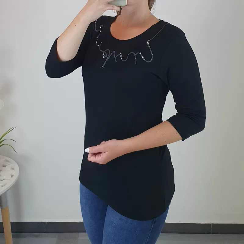 Ženska majica art. 315-019 je narejena iz bombaža. Majica ima rokava v dolžini 3/4 oz do komolcev. Majica je v črni barvi, ob vratu jo krasi siv napis ‘inspire’, na sam napis so prišite še perlice.