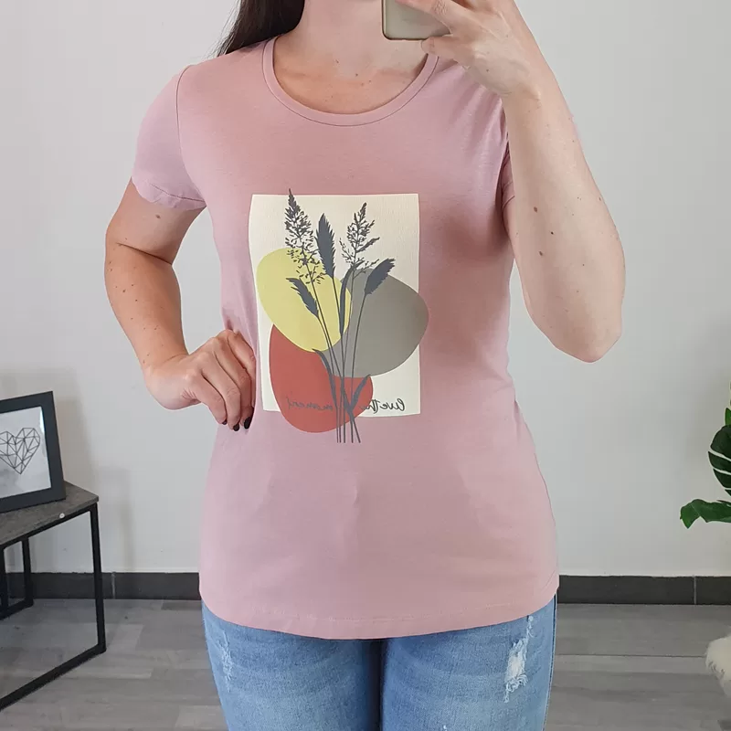 Modna bombažna majica v roza barvi s kratkimi rokavi. Na sprednji strani majice je dodan tisk in napis ‘live the moment’. Majica je tanjša in lahka, odlična za toplejše dni.
