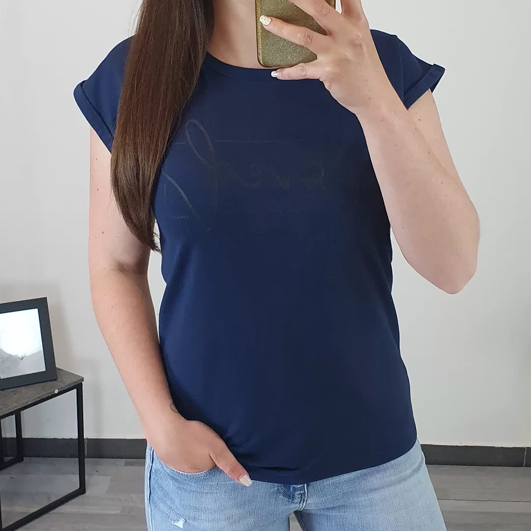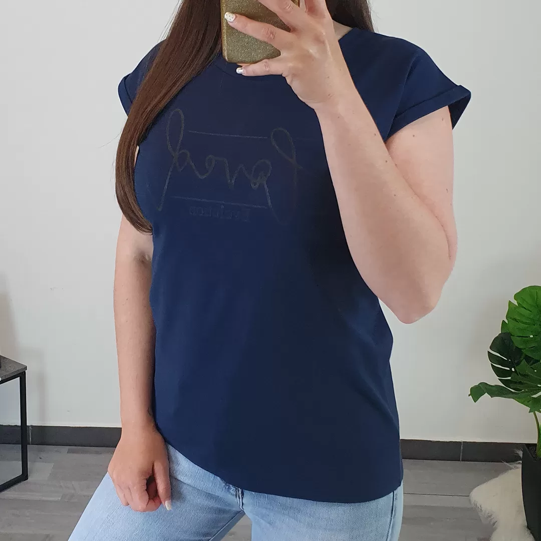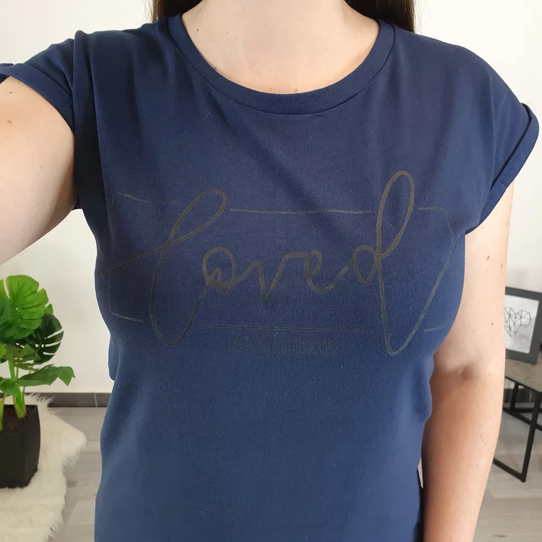 Ženska majica v temno modri barvi. Majica ima kratka rokava, je širšega kroja, zadaj malenkost daljša. Majica ima na sprednji strani tisk ‘loved evolution’ v temnejši barvi.