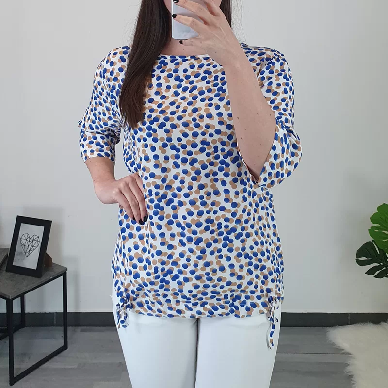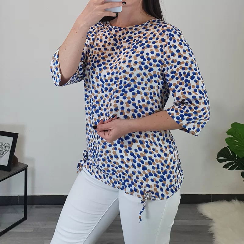 Ženska lahka majica s tiskom pikic v modri in bež barvi. Majica ima 3/4 rokava in je širšega modela. Na koncu sta dodani dve vrvici, da lahko majico oblikujete. Izdelana je iz kvalitetne viskoze, je zračna in lepo pade.