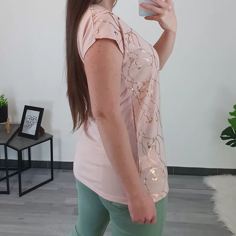 Modna ženska majica v roza barvi. Majica ima kratka rokava in je malenkost širšega kroja. Na sprednji strani jo krasi roza tisk sider, na zadnji strani je enobarvna.
