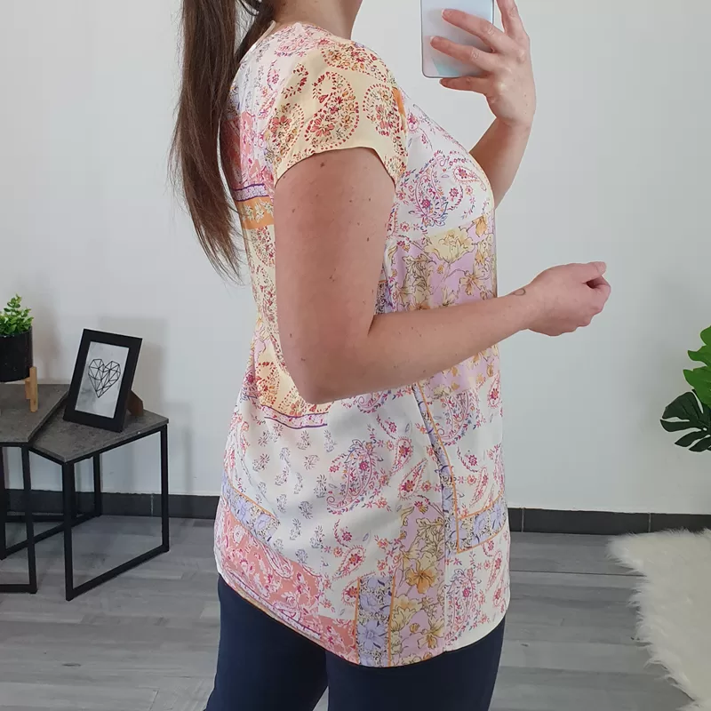 Ženska pisana majica s kratkimi rokavi. Narejena je iz kvalitetne viskoze, je zelo lahka in zračna, kroj majice je malenkost širši in lepo pade. Majica je v kombinaciji različnih barv, prevladuje pa rumena. Na voljo je od številke XS do XL.