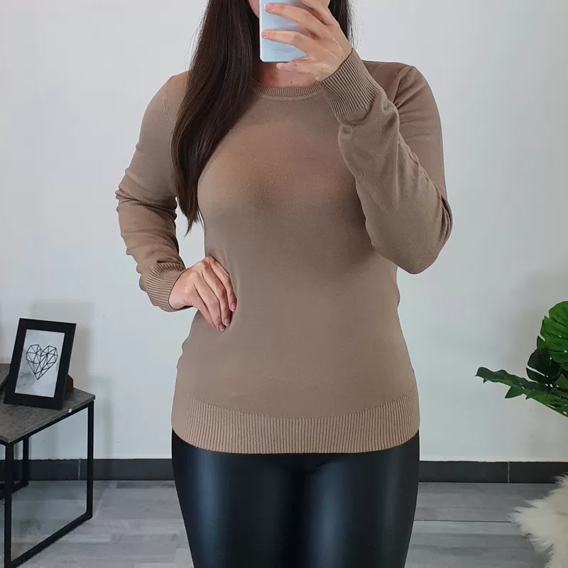 Ženska majica v rjavi barvi z dolgimi rokavi. Majica je izdelana in bolj toplega materiala in je primerna za bolj hladne dni. Majica se na spodnjem delu in rokavih zaključi z rebrastim patentom. Enak detajl je dodan še ob ovratniku. Na voljo je od številke S do XXL.