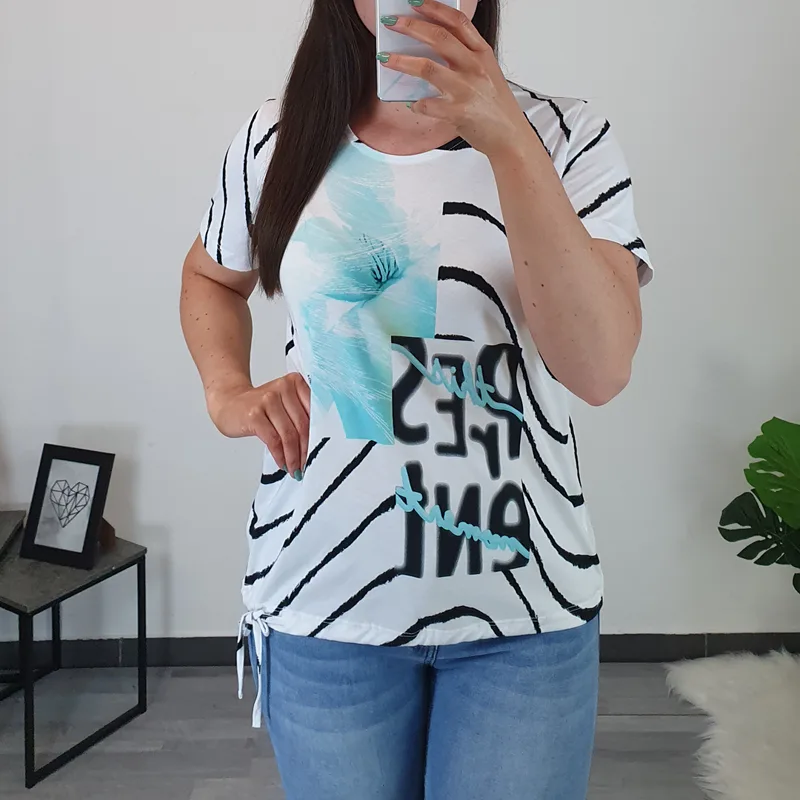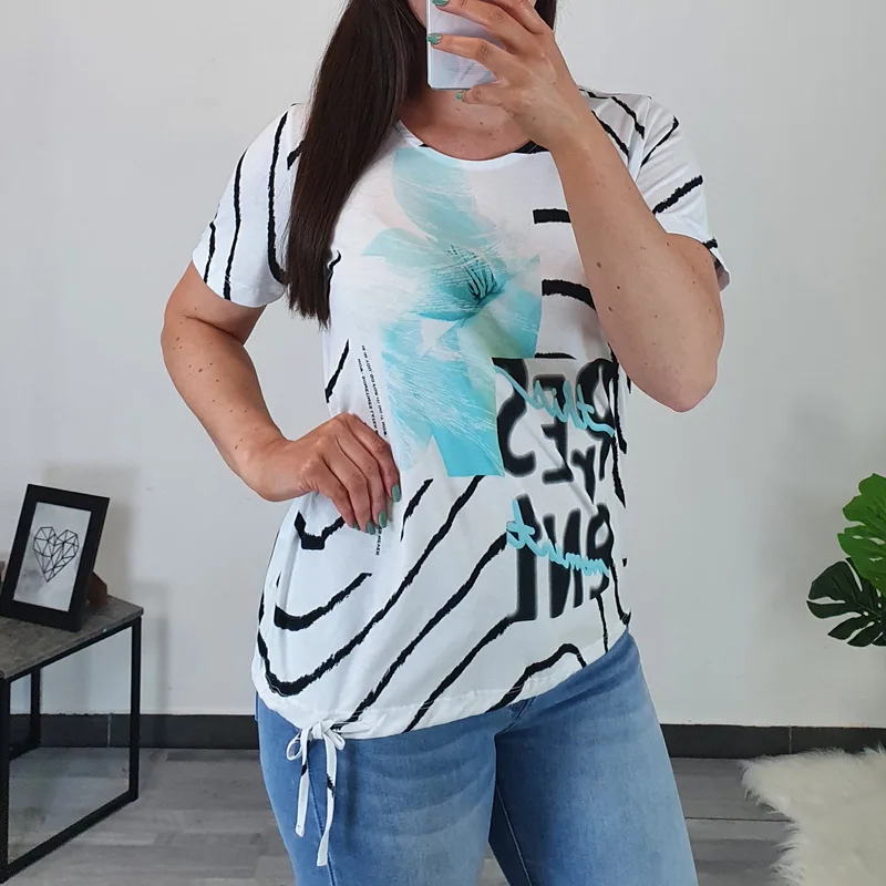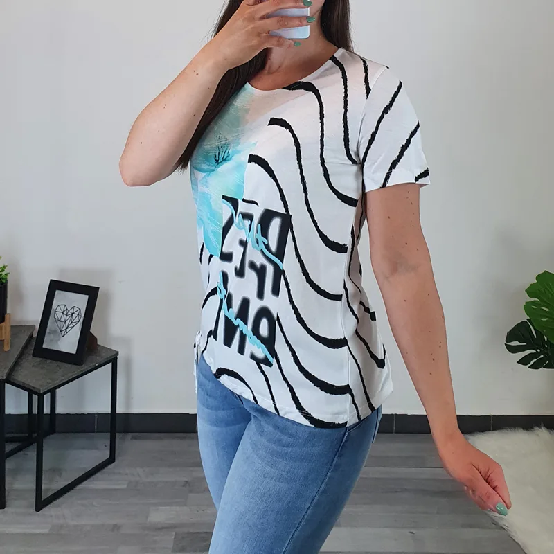 Modna ženska majica je v osnovi v beli barvi, kombinirana s črnim vzorcem in tiskom. Majica ima kratka rokava, je širšega kroja in se zaključi z elastiko. Narejena je iz viskoze, je zračna in primerna za tople dni. Na voljo je od številke 36 do 48.