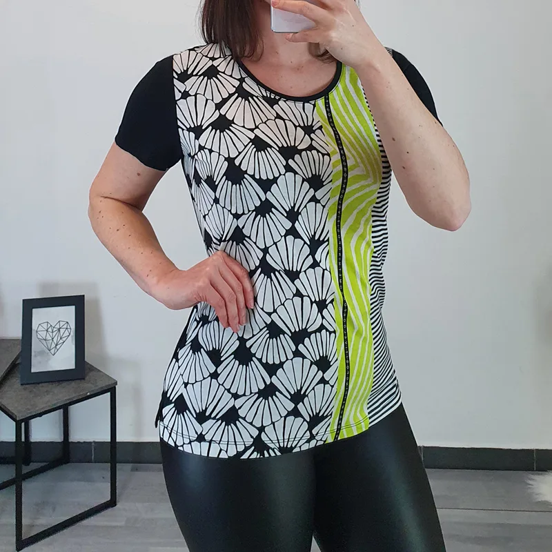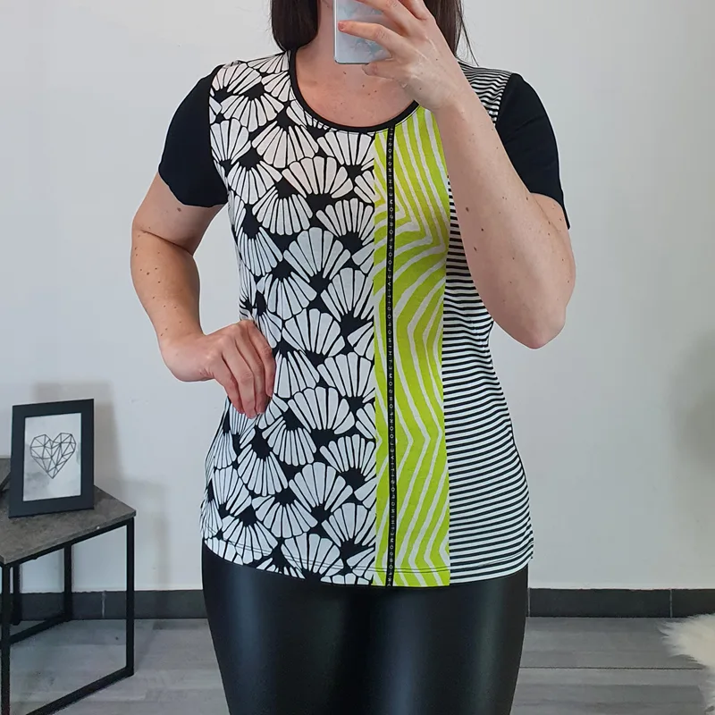 Ženska majica blagovne znamke Kenny S. Majica ima kratka rokava, kroj majice je širši in lepo pade. Majica je v kombinaciji bele, črne in zelene barve.