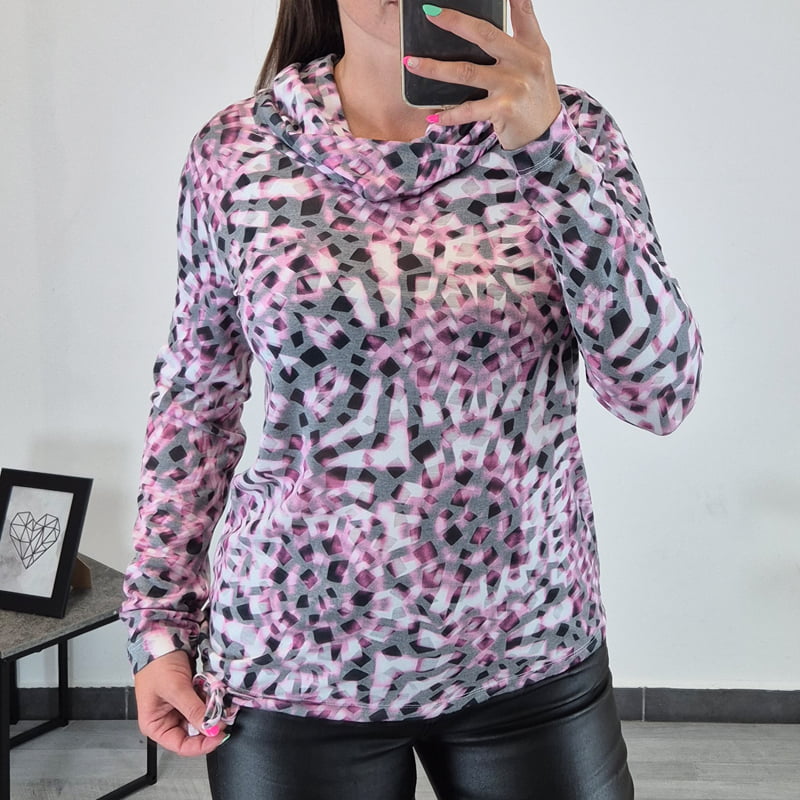 Ženska majica z dolgimi rokavi. Majica je narejena iz mehkega materiala z vzorcem v sivi, beli in roza barvi. Majica ima viseč ovratnik, kar jo naredi posebno. Kroj majice je širši – ni oprijeta, na koncu je dodana vrvica, da se lahko oblikuje.
