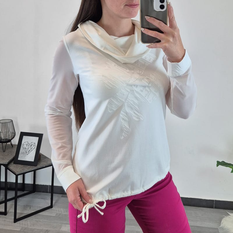 Ženska majica z dolgimi prosojnimi rokavi, ki se zaključijo s patentom. Majica je narejena iz kvalitetne viskoze s tiskom na sprednji strani v isti barvi. Ima viseč ovratnik, kar jo naredi posebno. Kroj je širši – ni oprijeta, na koncu je dodana vrvica, da se lahko oblikuje.