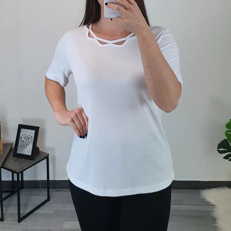 Elegantna ženska majica v beli barvi. Majica ima ob vratniku dodan trak in srebrne kamenčke, kar majico naredi posebno. Kratka rokava so malenkost podaljšana, kroj je širši – ni teliran. Na voljo od velikosti 38 do 46.