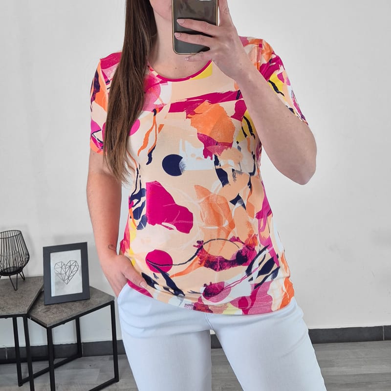 Ženska majica s kratkimi rokavi. Rokava se z večjimi številkami podaljšujejo. Narejena je iz visoko kvalitetne viskoze, zato je zelo lahka in zračna in primerna za tople poletne dni. Majica ima pisan vzorec v roza odtenkih. Na voljo je od številke S do 2XL.