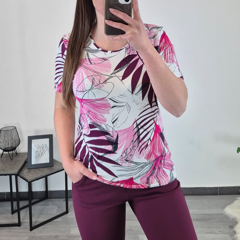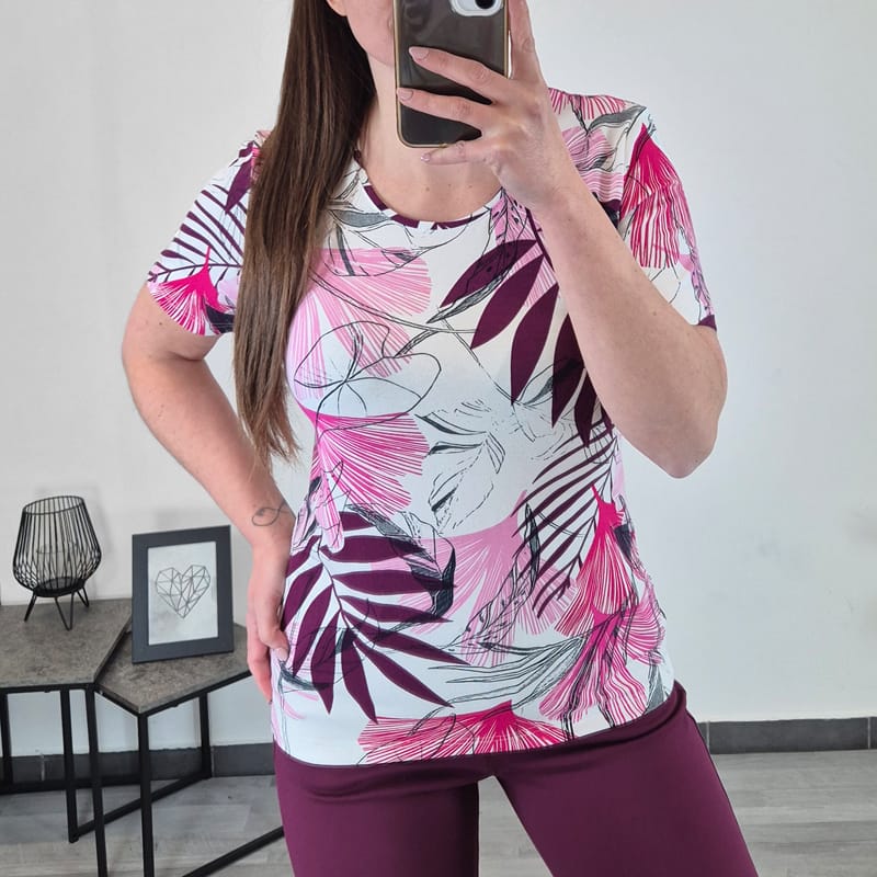 Ženska majica s kratkimi rokavi, ki se z večjimi številkami podaljšujejo. Narejena je iz visoko kvalitetne viskoze, zato je zelo lahka in zračna in primerna za tople poletne dni. Majica ima pisan vzorec v beli in roza barvi. Na voljo je od številke S do 2XL.