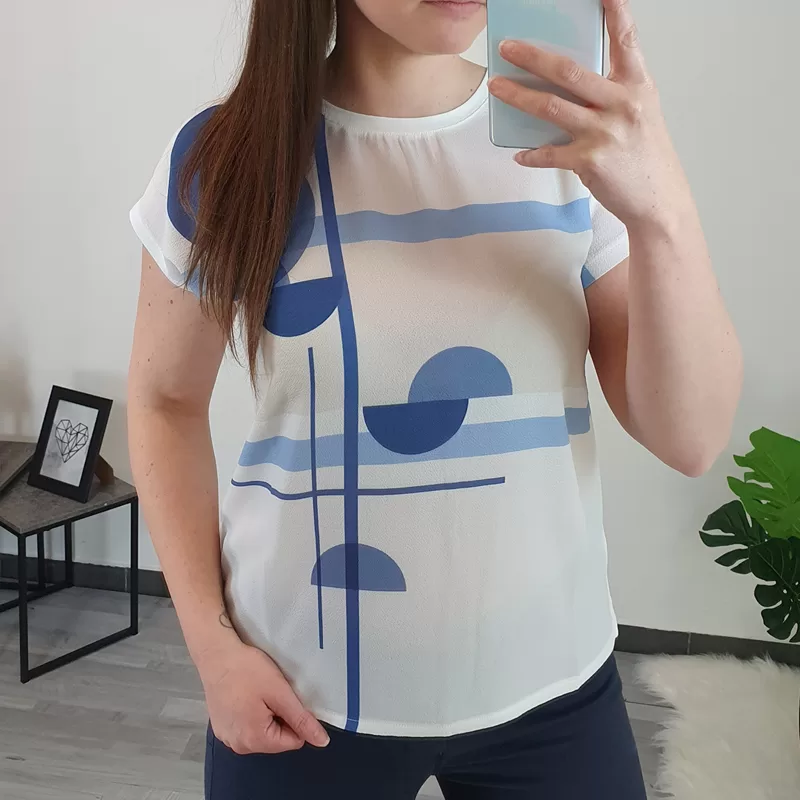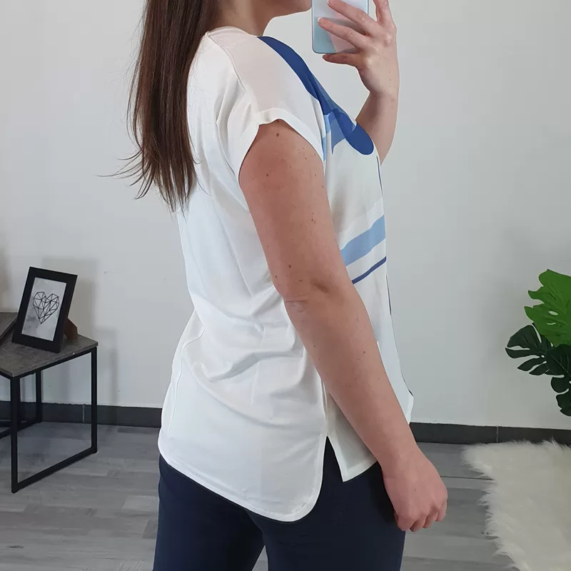 Ženska majica s kratkimi rokavi v beli barvi. Na sprednji strani so dodani vzorci v modri in bež barvi. Majica je izdelana iz lahkega in zračnega materiala. Je širšega modela, na zadnjem delu je podaljšana. Na voljo je od številke 38 do 50.