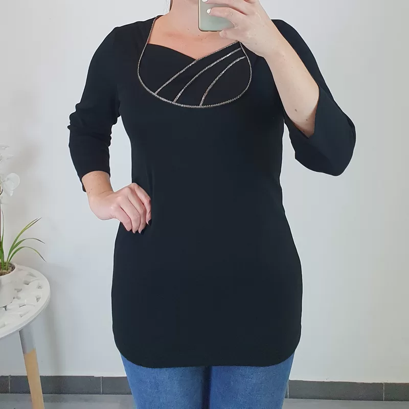 Majica Anaja s 3/4 rokavi. Majica je v črni barvi, ob vratu je kombinirana s srebrnim šivom, ki daje majici eleganten videz. Narejena je iz kvalitetnega bombaža in je krojena od velikosti 40 do 52.