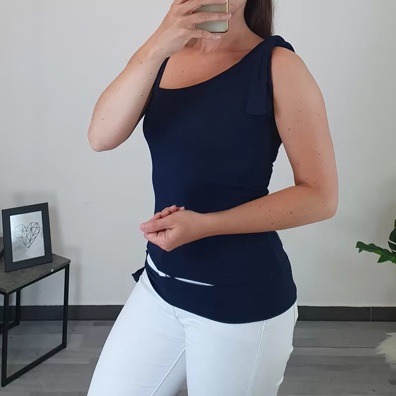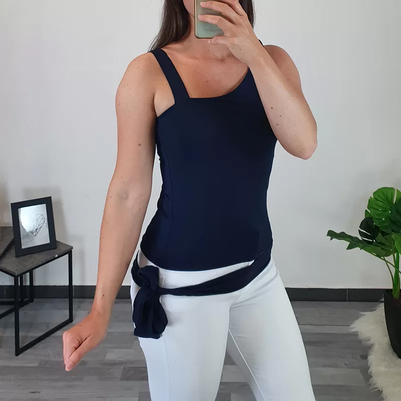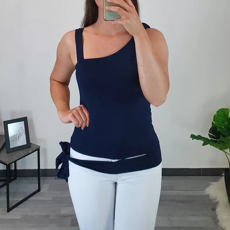 Ženska majica Anči v temno modri barvi. Majica je brez rokav, desna naramnica je izdelana iz dveh trakov, ki se zavežeta skupaj. Na spodnji strani je dodan trak, ki ga ob strani zavežete, majici pa daje izredno zanimiv izgled.