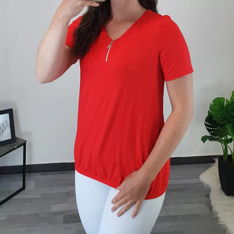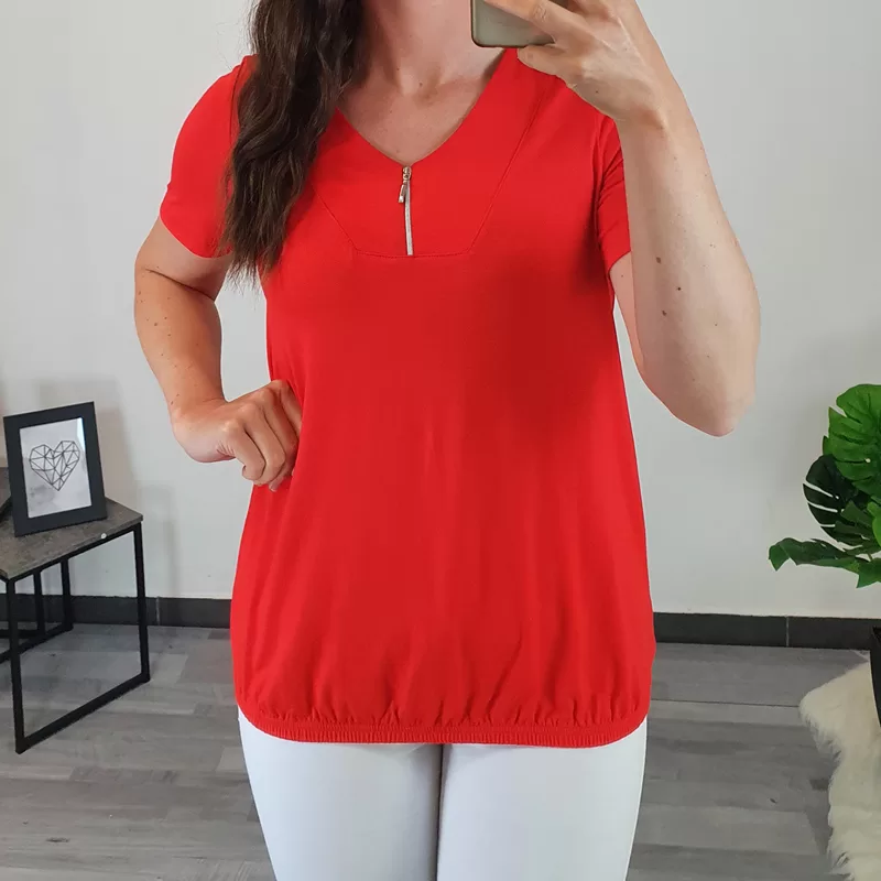 Ženska modna majica v rdeči barvi. Kroj majice je širši in se zaključuje z elastiko, ki se lepo prilega postavi, sama majica pa lepo pade ob telesu. Majica ima kratke rokave, ovratnik je izrezan na V, za lepši izgled pa mu je dodana srebrna zadrga. Majica je izdelana iz kvalitetne viskoze.