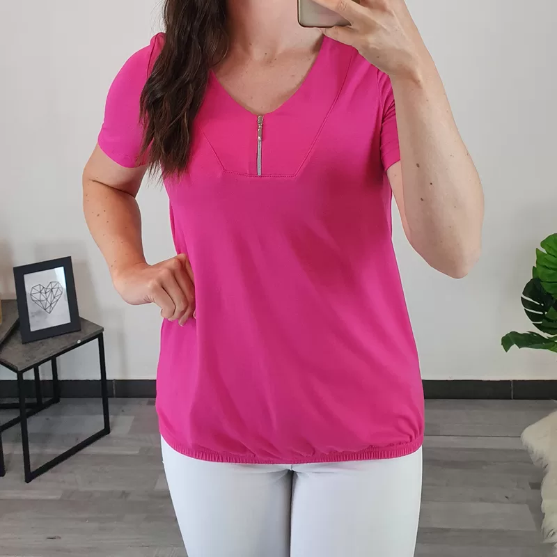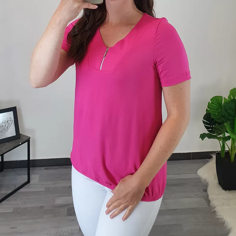 Ženska modna majica v roza barvi. Kroj majice je širši in se zaključuje z elastiko, ki se lepo prilega postavi, sama majica pa lepo pade ob telesu. Majica ima kratke rokave, ovratnik je izrezan na V, za lepši izgled pa mu je dodana srebrna zadrga. Majica je izdelana iz kvalitetne viskoze.