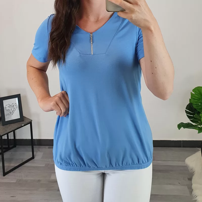 Ženska modna majica v svetlo modri barvi. Kroj majice je širši in se zaključuje z elastiko, ki se lepo prilega postavi, sama majica pa lepo pade ob telesu. Majica ima kratke rokave, ovratnik je izrezan na V, za lepši izgled pa mu je dodana srebrna zadrga. Majica je izdelana iz kvalitetne viskoze.